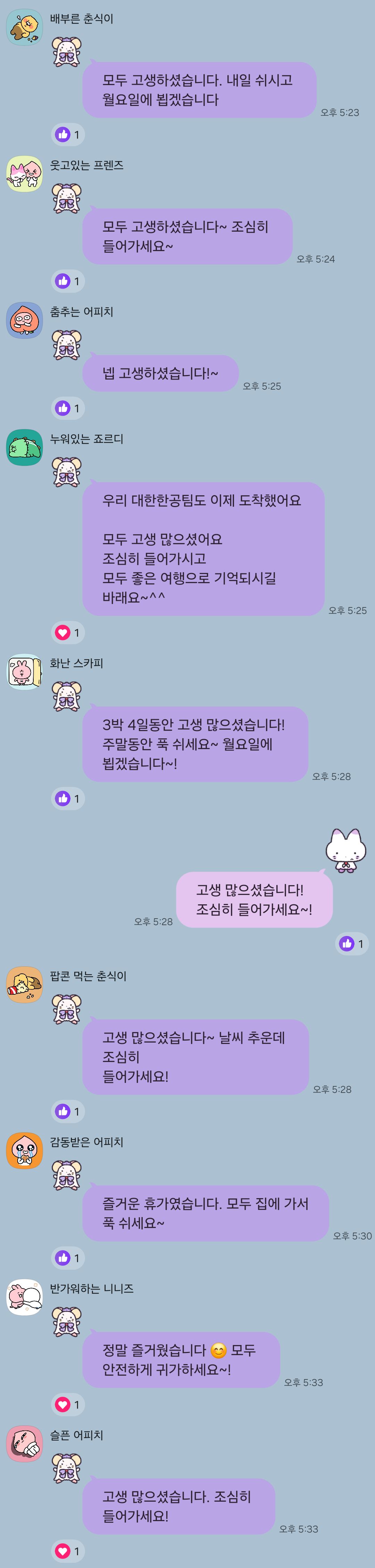 모두가 잠시 재충전의 시간을 보낸 만큼, 돌아온 후 더 건강한 분위기 속에서 함께 업무에 집중할 수 있을 것이라 기대됩니다.